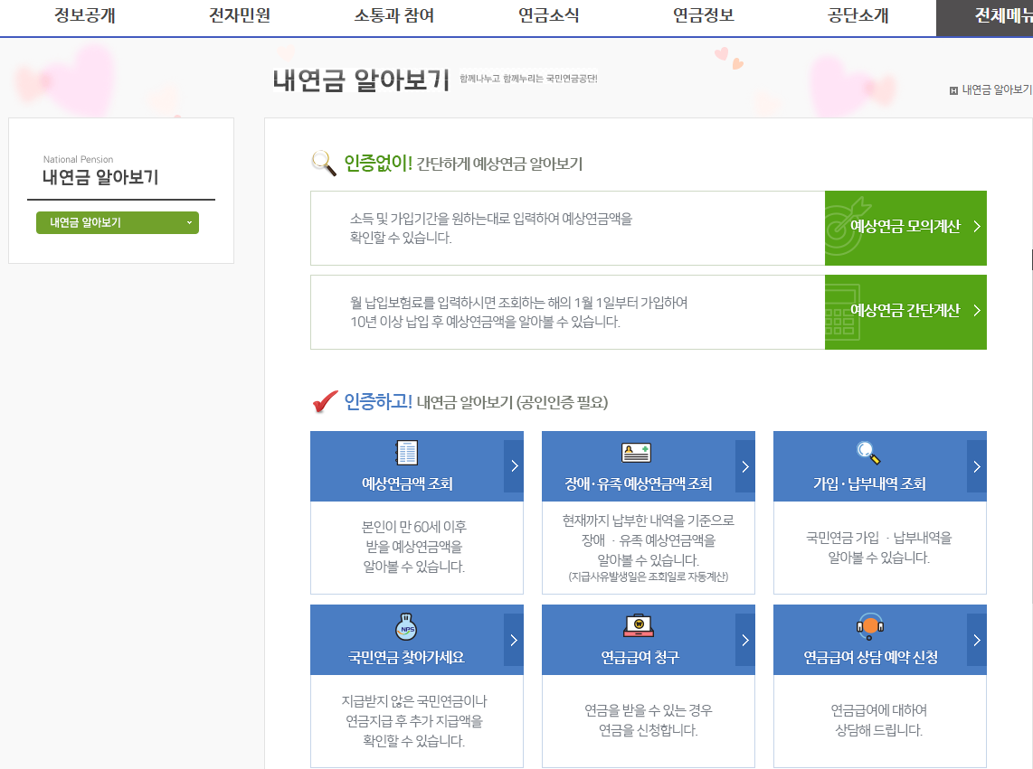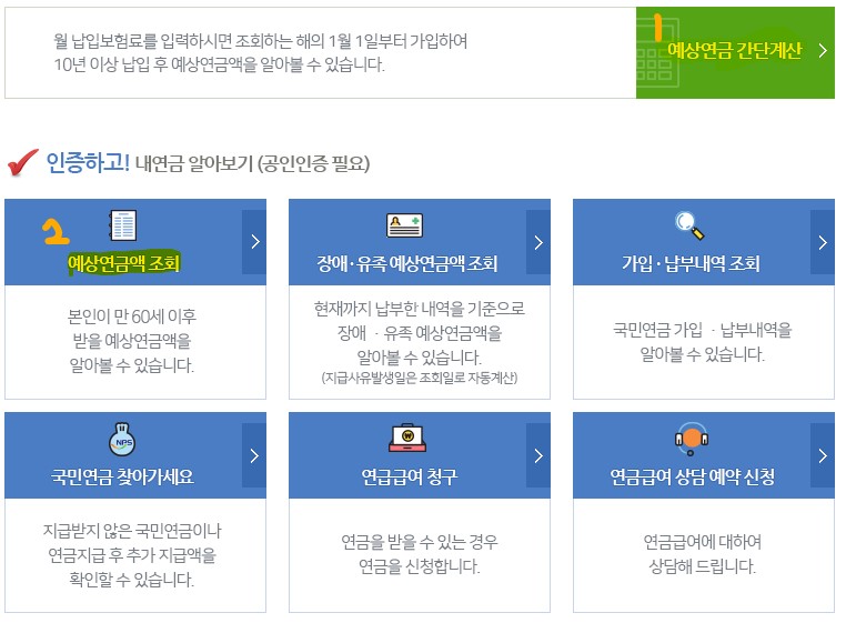 ① : 인증 없이 대략적으로 계산할 수 있는 건 아래에서 초록색 - '예상연금 간단계산'을 누르시면 됩니다.