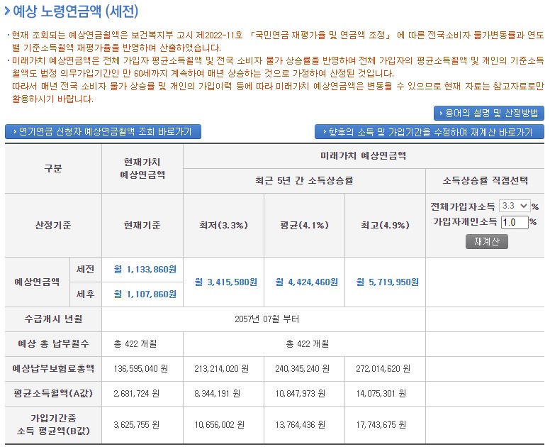 본 결과는 국민연금에서 물가 상승률를 반영하여 계산되었지만 실제 물가상승률과 월 소득액이 상이하게 되면 본 예상 연금액은 달라질 수 있습니다.