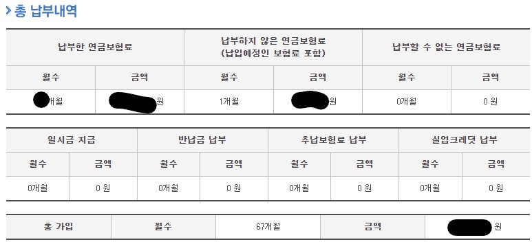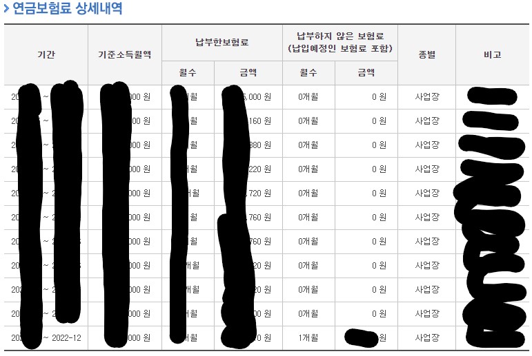 총 67개월동안 국민연금을 납부한 내역을 확인할 수 있습니다. 조금 더 세부적인 내용은 아래와 같이 나오게 됩니다. 어느 사업장에서 얼마의 금액을 납부했는지 몇개월동안 근무한 사업장인지 모두 나오게 되니 한 번에 확인이 가능합니다.