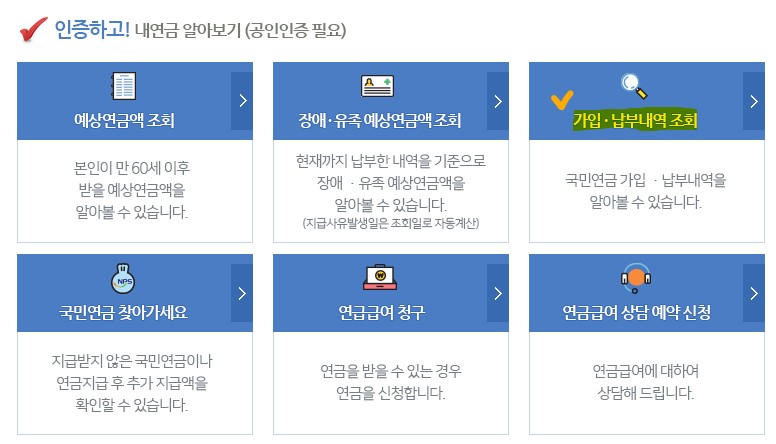 근데 얼마나 냈는지 금액을 확인하고 싶으신 분들이 많을 겁니다. 총 몇개월동안 얼마의 금액을 납부했는지 확인이 가능한데요. 아래 초기 화면에서 가입 납부내역 조회를 클릭합니다.