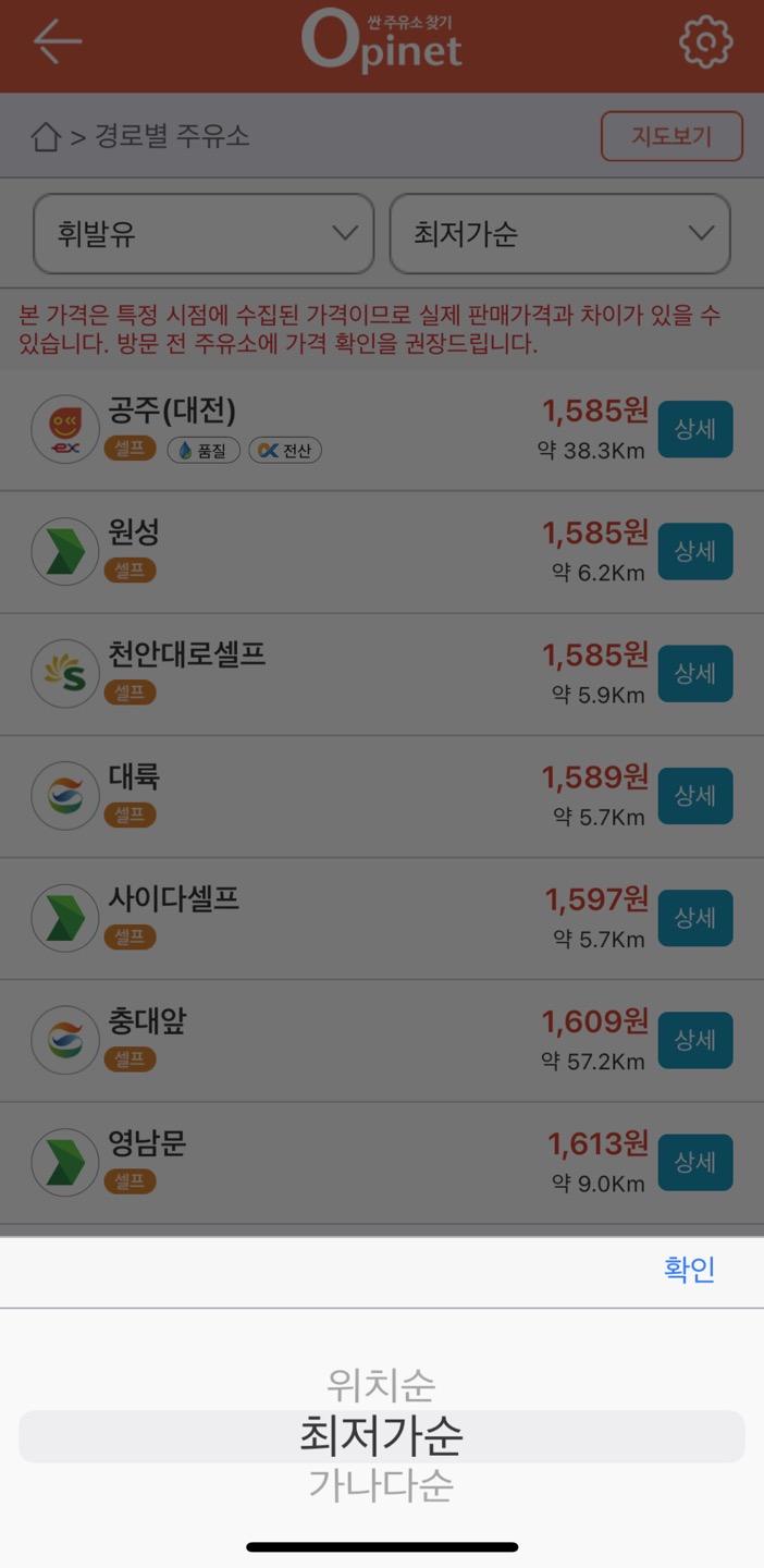 위와 같이 거리에 따라서 저렴한 주유소를 찾을 수 있습니다. 위 정렬 방식은 아래 3가지 방식으로 선택하여 볼 수 있습니다.
