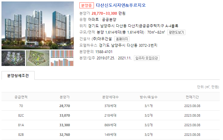 아래의 공급 가격에 대한 정보 표로 정리하였습니다. 계약금은 3 천만 원 초반의 가격입니다. 현재 남양주 다산의 시세를 고려하면 정말 저렴한 가격입니다. 아무리 아파트 가격이 내려간다고는 하지만 이 정도 이하로 내려가진 않을 것으로 생각됩니다. 층수도 낮지 않아 선호도도 높아 경쟁률이 상당히 높을 것으로 예상됩니다.