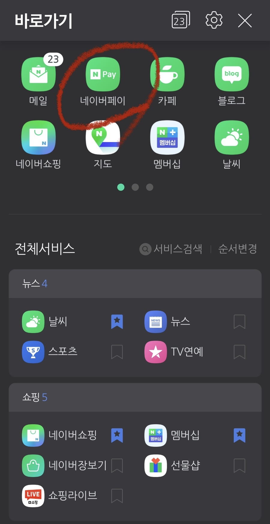 위 메뉴로 들어가서 네이버 페이로 들어가주세요