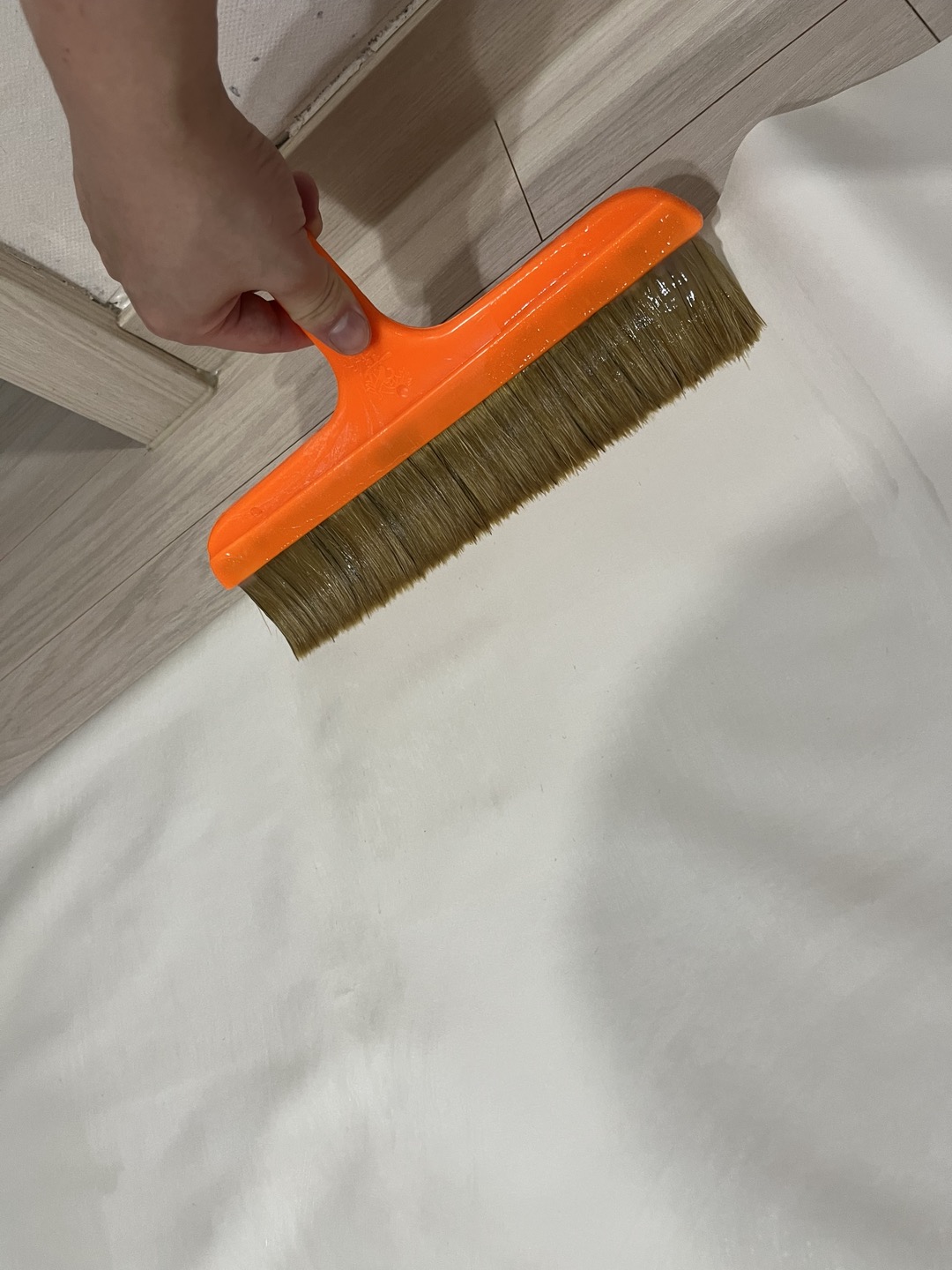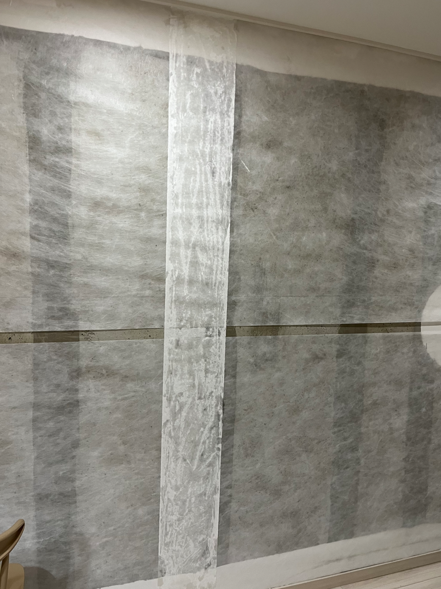 아까 위에서 모든 초배지가 모두 채워졌어야 했는데 가운데 부분을 채우지 않아서 저렇게 모양이 잡혀버렸습니다. 잘 덮어놓을 수 있게 해주세요. 그리고 벽지끼리 맞닿는 부분이 산모양(人모양)처럼 약간 올라오게 모아서 부착해주세요. 그 뒤에 롤러로 마무리 해줍니다.