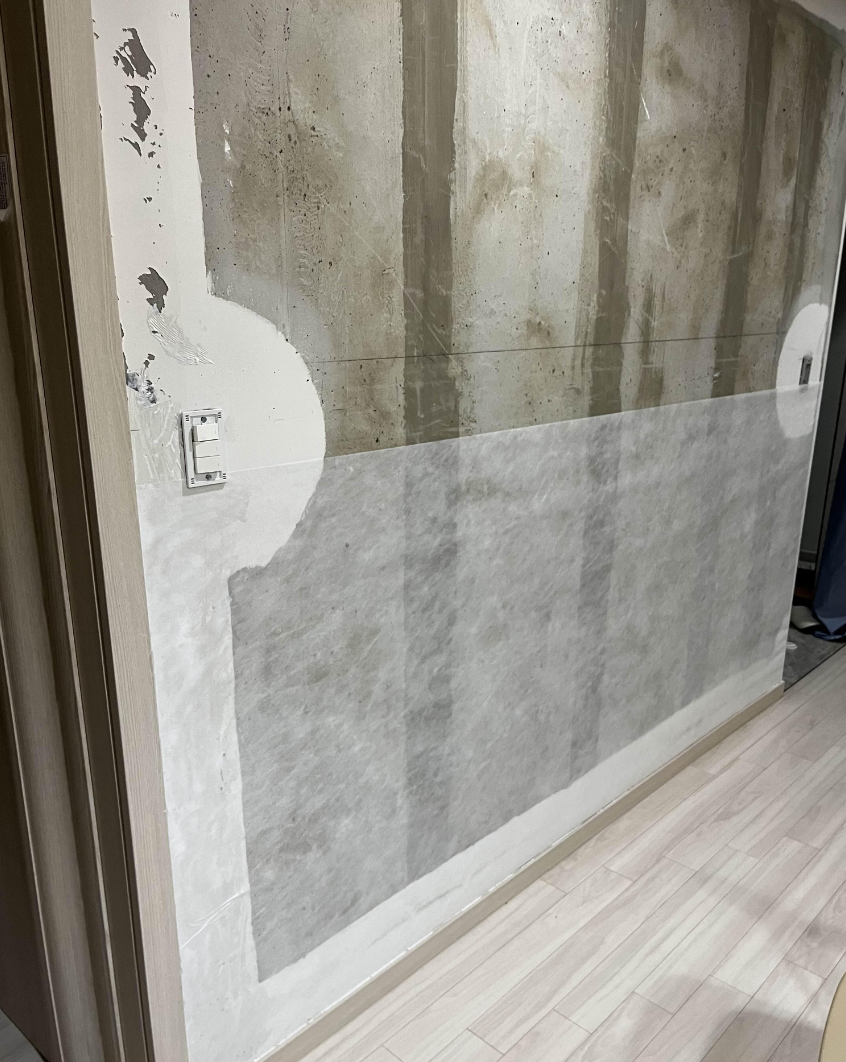 벽지를 완전히 제거해줍니다. 제대로 제거하지 않으면 벽지 시공을 하고 난 부위가 고르지 못하게 됩니다.