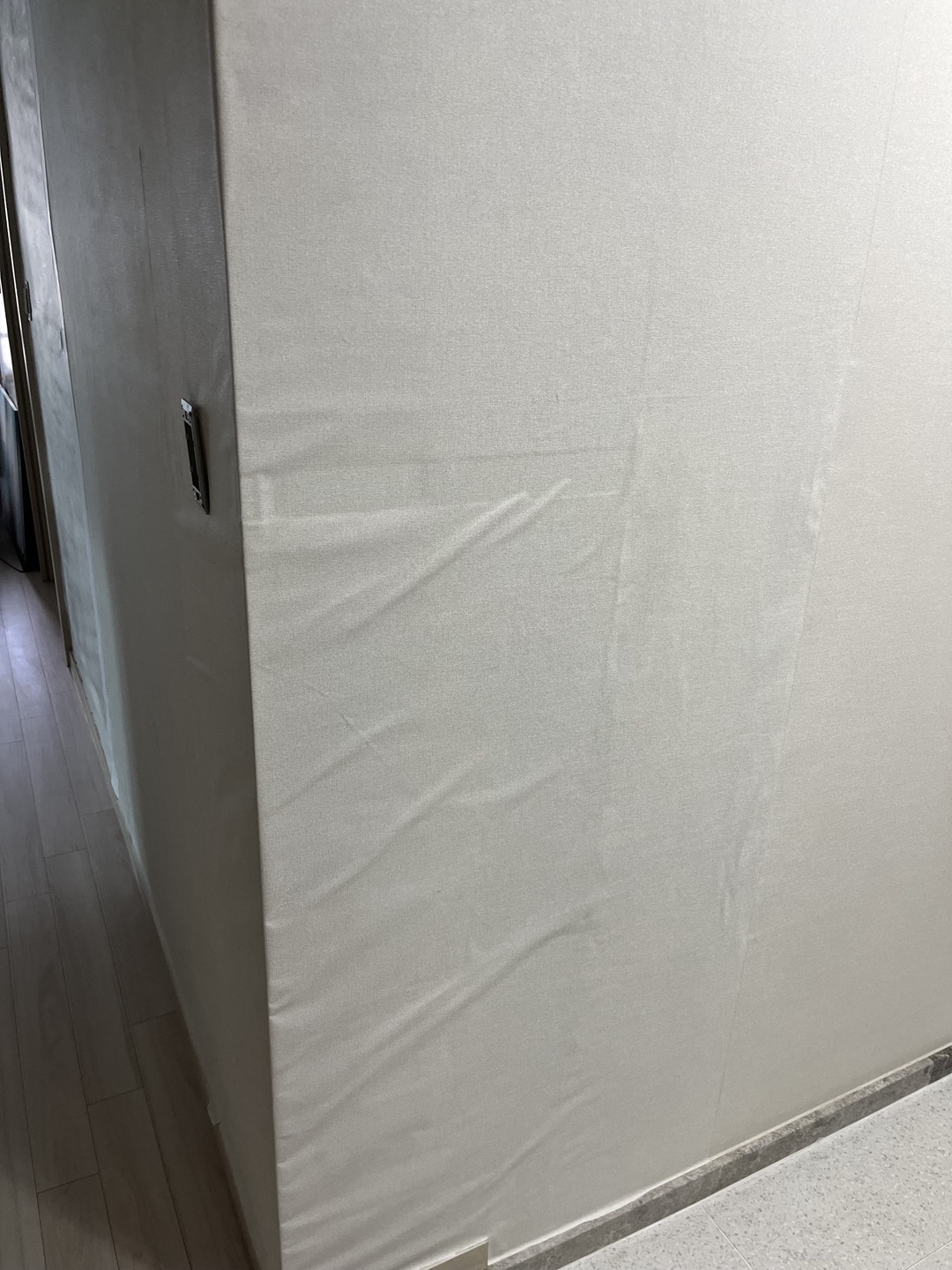실크벽지는 벽에 완전히 붙이는게 아니라 벽과 살짝 떨어져있습니다. 실크벽지를 만져보시면 벽과 살짝 공간이 있는 걸 보셨을겁니다.