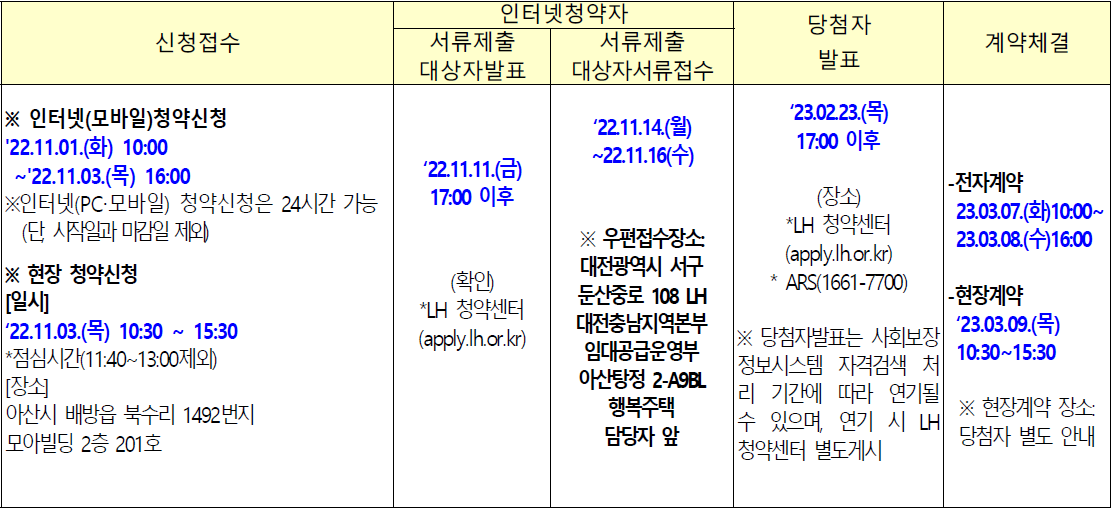 청약은 2022년 11월 01일 오전 10시부터 3일 오후 4시까지 신청할 수 있습니다. 청약은 신청 시작부터 마감때까지 24시간 동안 신청이 가능합니다. 청약은 어플/PC로 신청할 수 있으며 인터넷 사용이 어려우신 어르신분들은 현장에서도 신청이 가능합니다. 신청은 아산시 배방읍 북수리 1492번지 2층 201호에서 신청이 가능합니다. 서류 제출 당첨자는 11월 11일 저녁 5시 이후에 발표되며 서류 제출은 11월 14일부터 16일까지 제출해야 합니다. 서류대출은 우편을 통해 제출해야 하며 대전광역시 서구 쪽으로 보내야 합니다. 최종 당첨자는 서류 검수 후 2023년도 02월 23일에 발표됩니다.