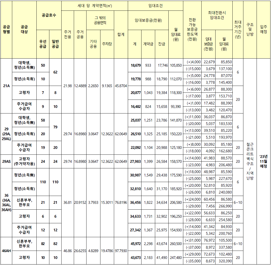 46형의 경우 신혼부부, 한부모가정, 고령자만 신청할 수 있으며 최대 임대금액이 7600만원에 월 10만 5000원입니다.