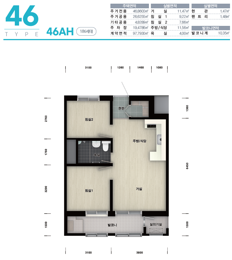 46형의 경우 36형과 구조는 거의 동일하며 크기에 차이가 있습니다. 주방이 'ㄷ'자'ㄷ'자 형으로 되어 거실과의 구분이 되는 것 같습니다. 46형도 36형처럼 창 밖으로 다른 동이 보입니다. 그리고 현관 펜트리도 'ㄷ'자 형으로 수납공간도 더 넓습니다.