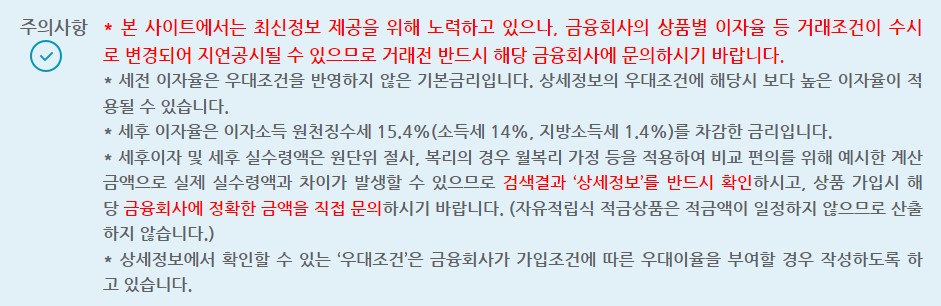 • 금융회사 상품별로 이자율 및 거래조건이 수시로 변경될 수 있습니다. 그렇기 때문에 최종 가입 전에는 해당 금융사 홈페이지/어플에서 확인하시고 가입하시길 바랍니다.