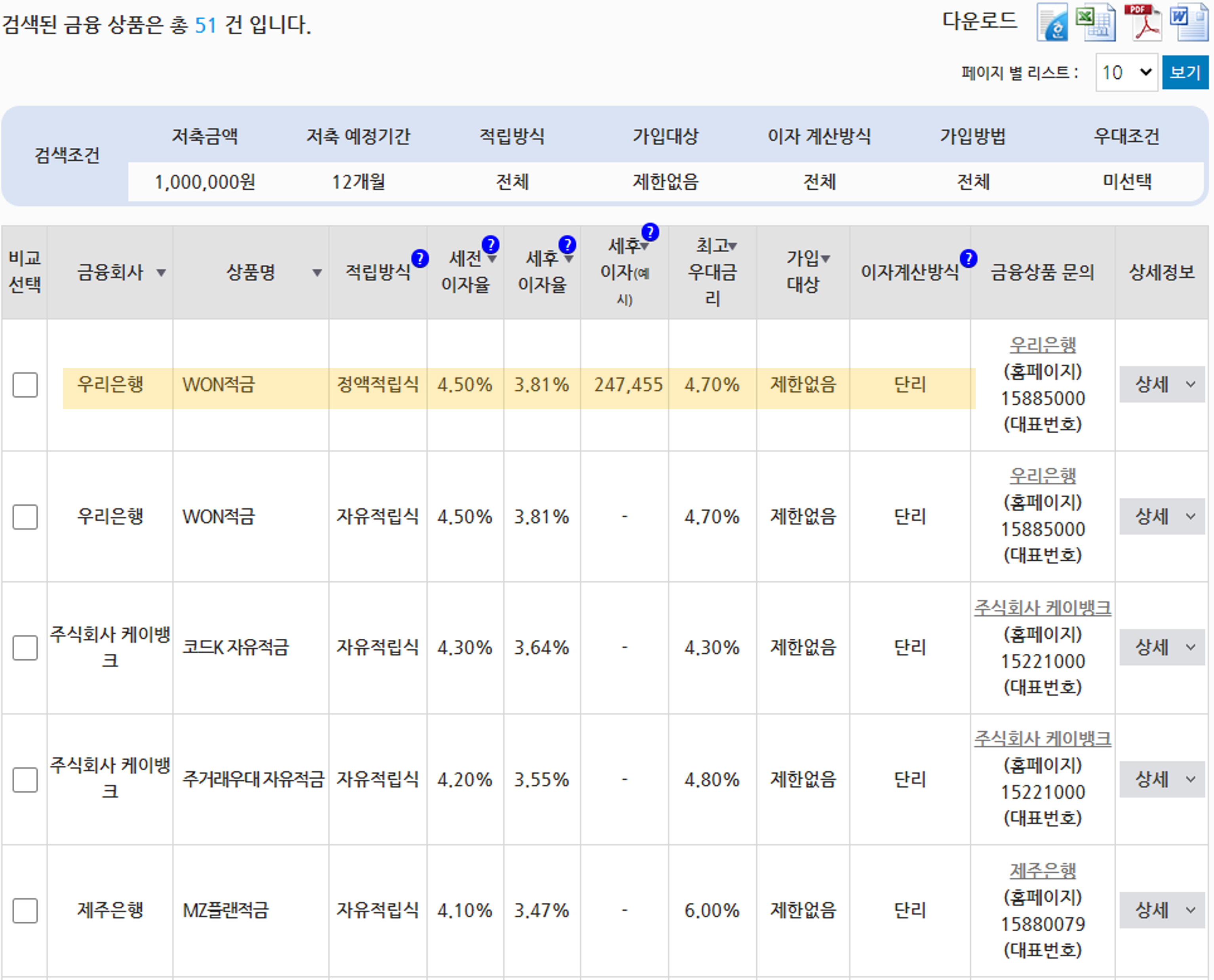 검색을 하시면 아래와 같이 모든 정보가 나열되며, 이자율을 큰 순서대로 한 번에 확인이 가능합니다.
