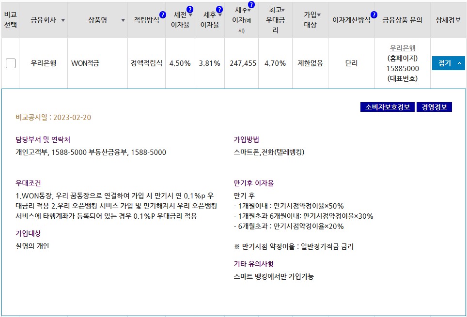 저축은행을 제외한 일반 은행으로 검색하면 위와 같이 은행권만 확인할 수 있습니다. 우리은행의 상품이 4.5%의 기본 이율에 0.20% 우대이율이 있는 것을 확인할 수 있습니다.