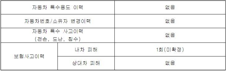 기본 정보를 확인하고 이 차량만의 이력들을 확인해봅니다. 차량의 이력은 감정평가서에 모두 나와있습니다. 감정평가사가 가격을 정할때 사고, 도난, 침수 이력 등을 모두 확인하고 가격을 최종적으로 선정하기 때문입니다. 감정평가서 내 이력은 아래와 같이 정리가 되어 나와있습니다.