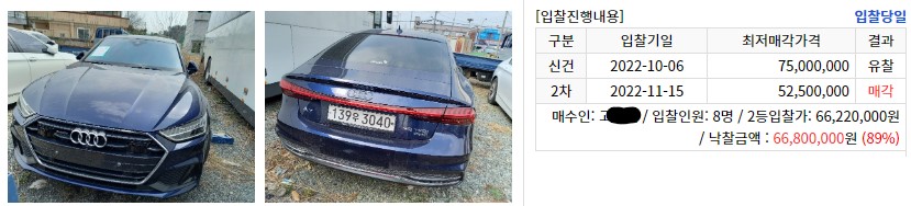 위와 같이 경매 결과에 따라 낙찰을 받는 경우 잔금을 낸 뒤에 차량의 소유권을 이전시킬 수 있습니다. 잔금 처리 후 차량을 찾아서 회수하게 됩니다. 이렇게 시세보다 조금 더 저렴하게 차량을 구할 수 있습니다. 차량을 실물로 확인해야하고 경매에 나온 물건으로만 진행할 수 있기 때문에 중고차를 사는 과정과 차이가 날 수 있습니다.