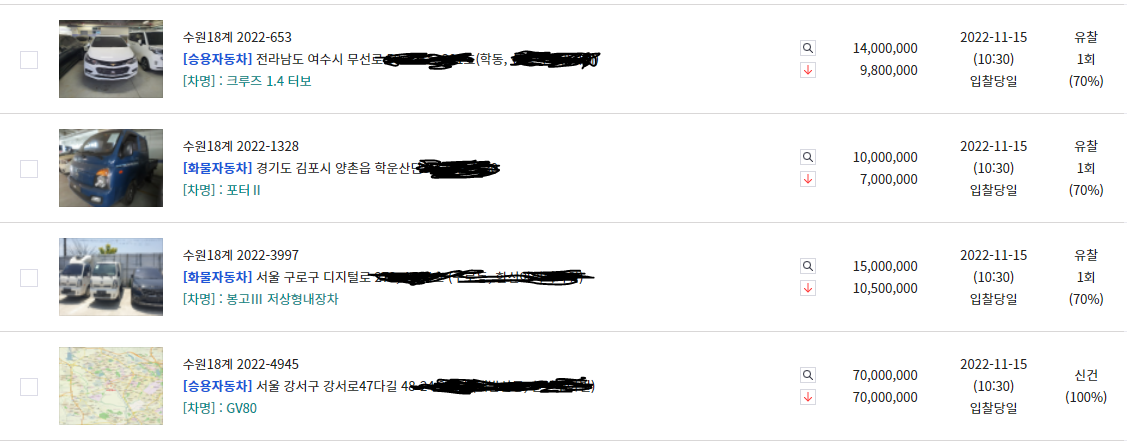 경매 사이트에 가면 여러 차량 물건들이 있습니다. 자동차 이외에도 선박, 중장비, 화물자동차 등 다양하게 있습니다. 아래와 같이 검색이 가능한데 가격과 차량의 정보를 쉽게 확인할 수 있습니다.