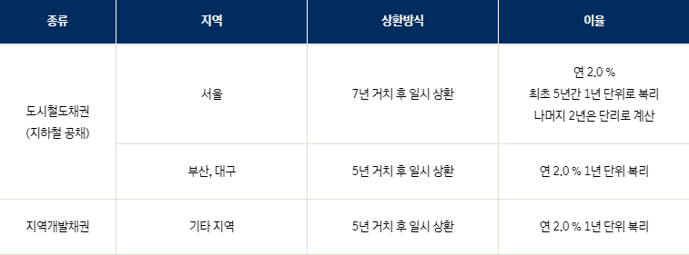 대중교통의 발달을 위해 차량 매입시 지하철/전철의 개발 및 운영에 사용될 수 있는 채권을 발행한 것입니다. 서울의 경우 7년 뒤에 만기이지만 부산, 대구의 경우에는 5년 뒤에 만기입니다. 그 외의 지역에서는 도시철도채권이 없고 지역개발채권을 매입하게 됩니다.