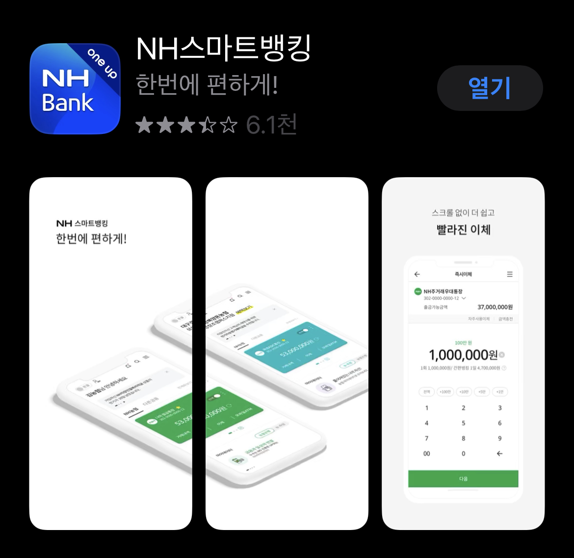 1. 농협은 은행어플이 정말 많은데 NH뱅킹으로 들어가주세요(없으신 분들은 설치 후 회원가입까지 하셔야 합니다.)