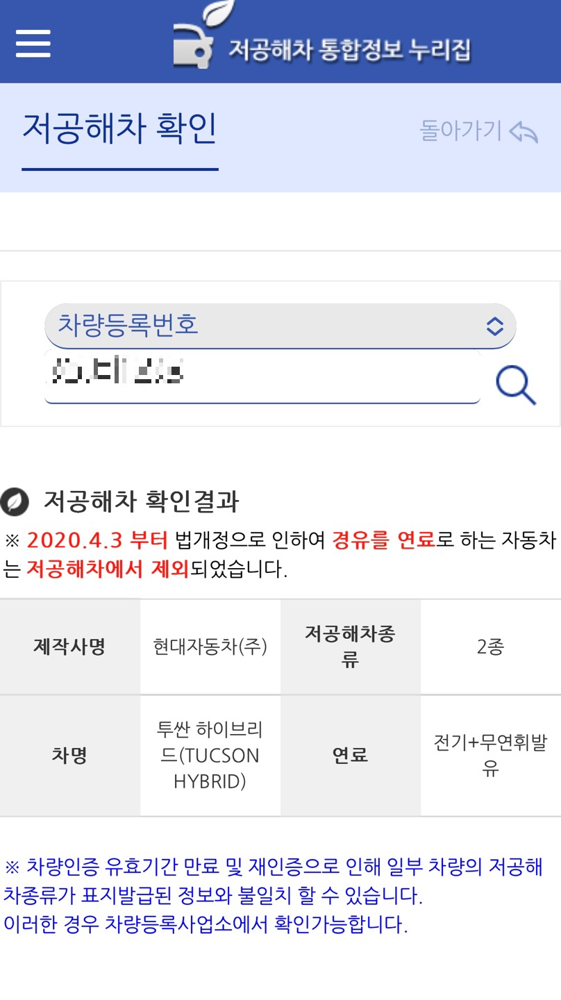 아래 홈페이지에서 차량번호를 입력하면 차량의 종류와 연료를 포함하여 몇 종의 저공해차량인지 확인이 가능합니다.