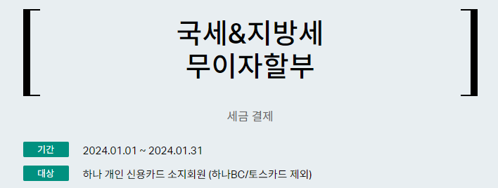 1. 5만원 이상 결제 건에 대해 부분 무이자 혜택이 제공됩니다.(하나 카드의 경우 지방세 결제시 고객 부담 수수료가 없습니다.)