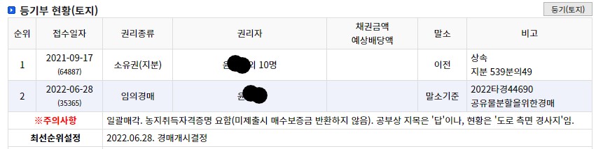 지분 경매의 경우 지분권자에게 알려지고 나머지 지분권자들에게 안내되는데 시간이 다소 소요됩니다. 그래서 다른 지분권자(공유자)들은 경매 진행상황에 대해 뒤늦게 확인할 수 있습니다. 다른 지분권자들의 매수심리에 따라 경매에 참여하시는 게 좋습니다.