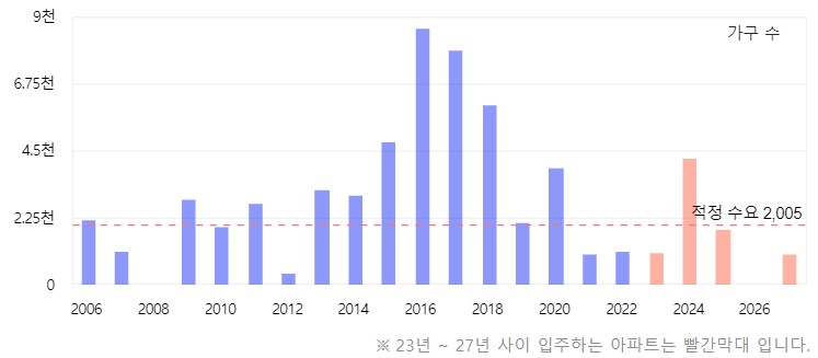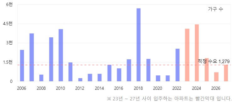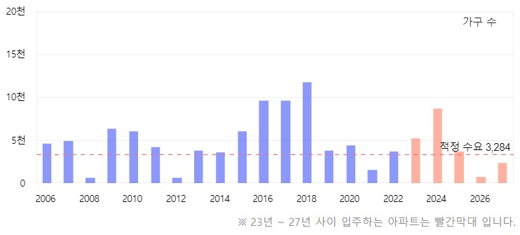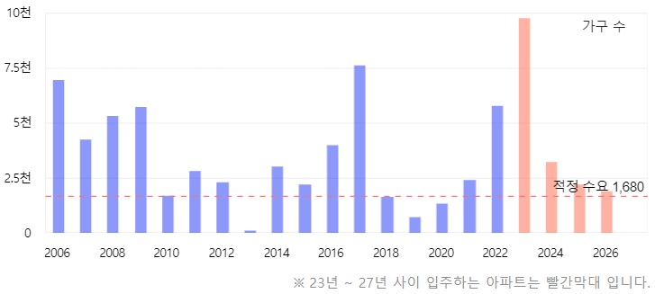 앞서 말씀드렸듯이 서북구의 경우 2024년도에 입주물량이 몰려있습니다. 하지만 2026년도에는 추가 입주물량이 없고 그 이후는 있지만 적정 수요 이하의 수준으로 확인되었습니다.
