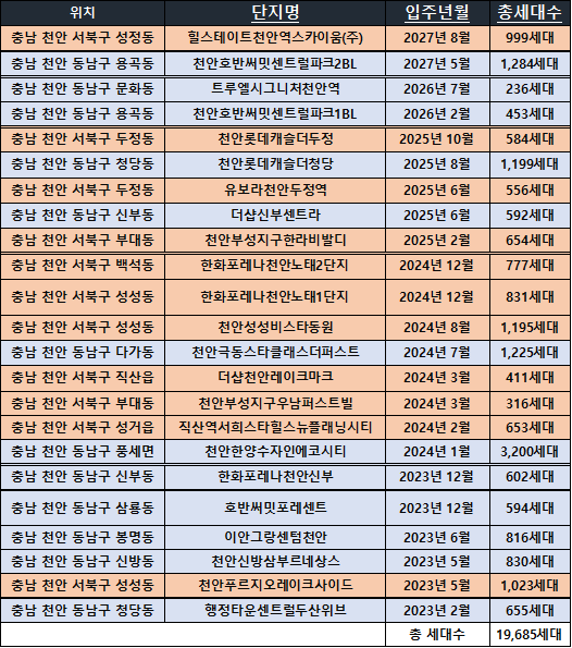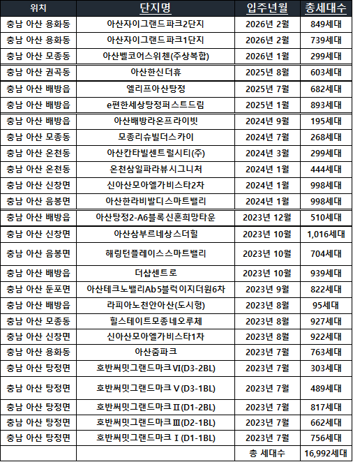우선 2023년도에는 선문대학교 좌측에 위치한 호반써밋그랜드마크 대단지가 한 번에 입주 예정이며 그 이후로 줄줄이 입주 일정을 보여주고 있습니다. 한 번에 입주 일정이 몰려있는 만큼 투자용으로 전세를 맞추려고하시는 분이나 기존 주택을 처분하려고 계획하셨던 분들께서는 자금 계획을 조금 더 안전마진을 두고 세우시는 것이 좋을 것 같습니다.