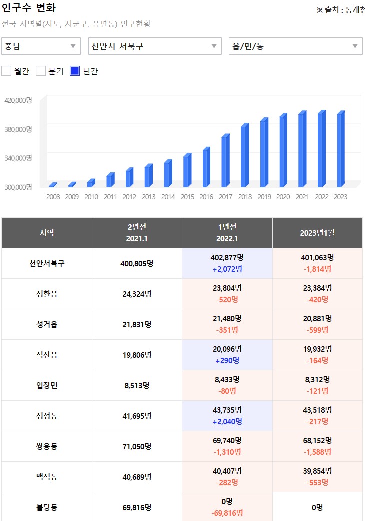서북구의 경우에도 인구가 증가하지는 않고 있습니다. 줄었다 늘었다를 반복하고는 있지만 평수준을 유지하고 있는 것으로 보입니다.(불당동의 경우 집계 오류가 있네요)