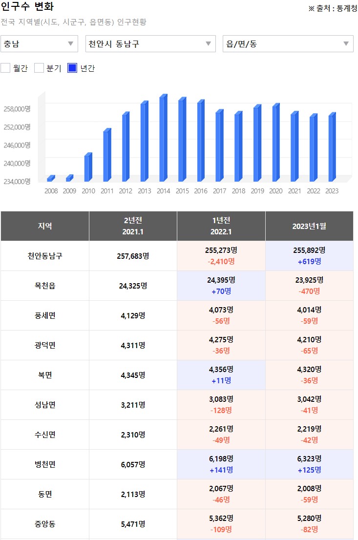 동남구의 경우 서북구보다 인구수가 적은데도 비해 입주물량이 더 큰 것으로 확인되었습니다. 게다가 현재 천안역사 주변으로 재개발이 진행되고 있는데 그 양까지 합하면 공급량을 추가될 것으로 예상됩니다. 이렇게 공급물량이 증가할 때는 인구(가구수)도 함께 확인이 필요합니다. 그만큼의 실거주 여력이 있는지 확인을 해야하기 때문입니다. 천안시의 인구는 어떻게 변화하고 있을까요?