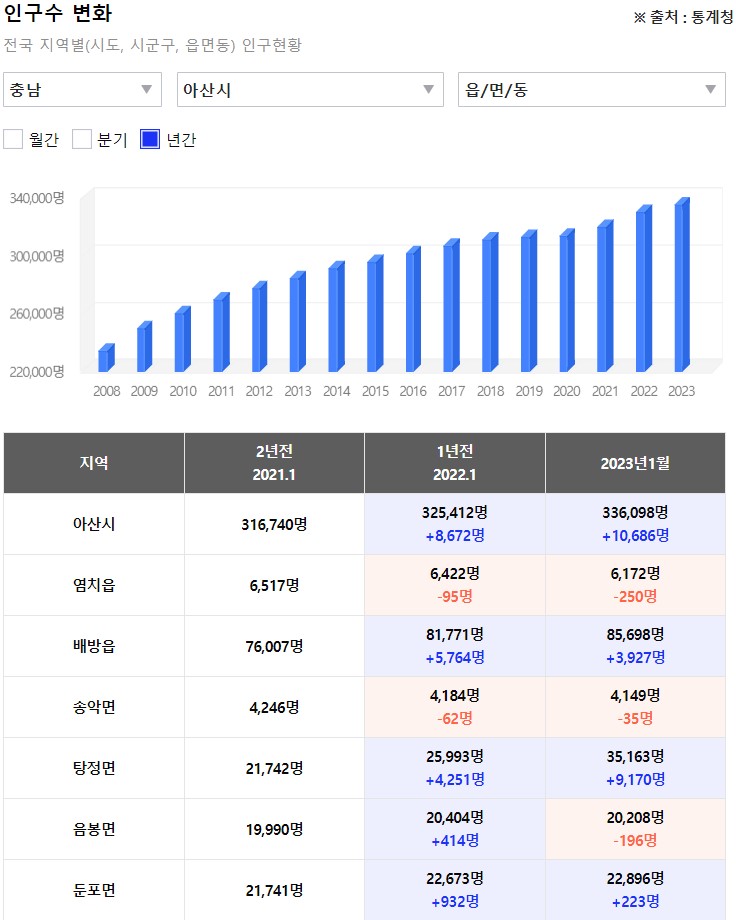 아산시의 경우 적정 수요보다 많은 공급물량을 2021년부터 공급하고 있습니다. 이게 2026년까지 진행되고 있는 것으로 확인되고 있으며, 아산시의 경우 개발계획이 많이 있기 때문에 공급물량은 계속 나올 것으로 예상됩니다. 이렇게 예상 수요보다 공급을 밀고있는 이유는 바로 도시개발사업때문입니다. 도시개발로 인해서 기업입주가 늘게되면 그만큼의 직원들도 늘어나게 되면서 입주가 살아나게 되기 때문입니다. 아산시의 경우 인구 유입이 지속적으로 증가하고 있으며 2022년도부터는 급격히 증가하고 있습니다. 특히 배방, 탕정을 중심으로 개발이 진행되면서 천안아산역 주변으로 인구이동이 많아지게 될 것으로 예상됩니다.