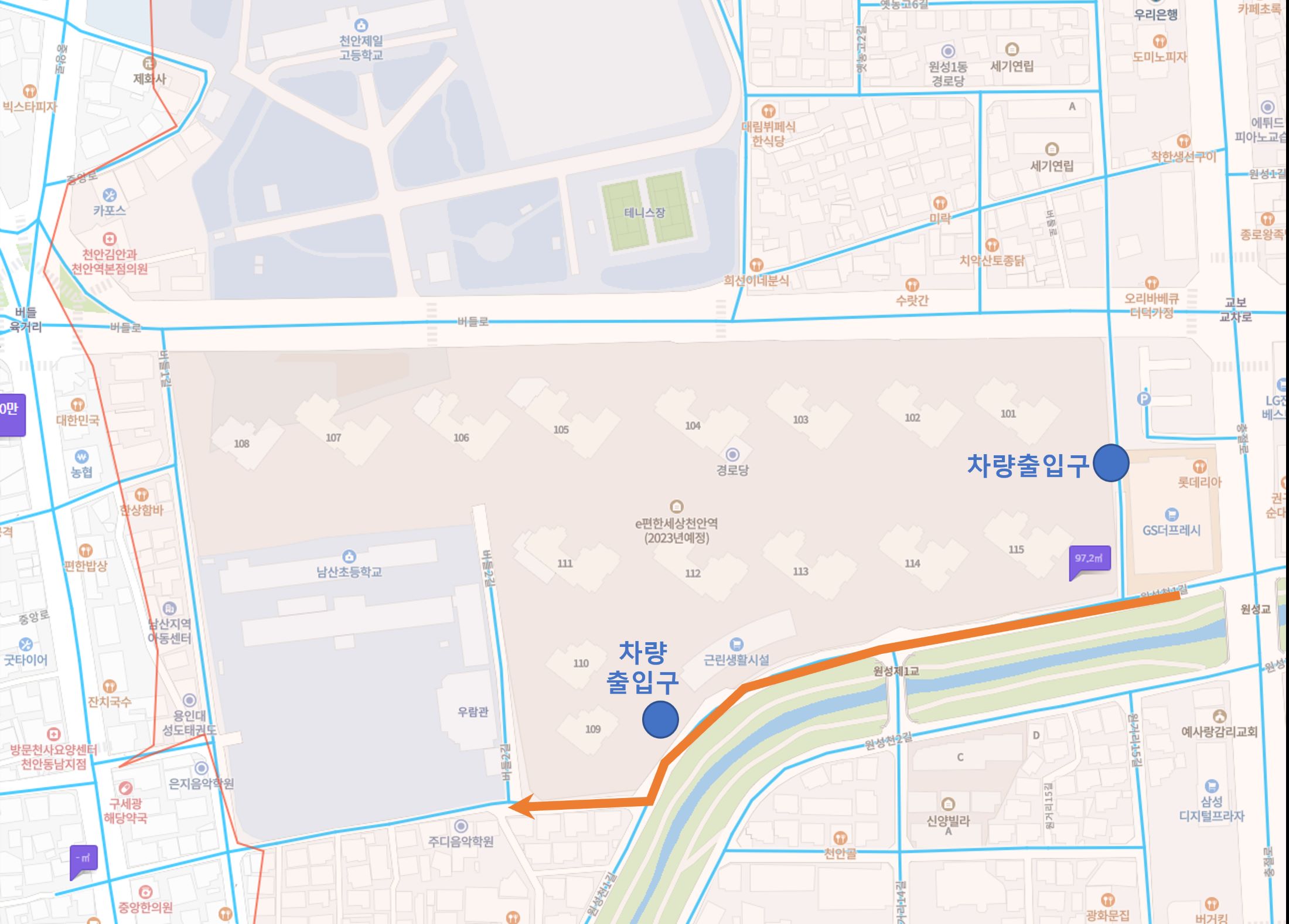 천안고 방향에 있는 107동과 106동 사이에도 차량 출입구가 있습니다. 세대수가 많다보니 차량 출입구를 세곳으로 나눈 것으로 보여집니다.