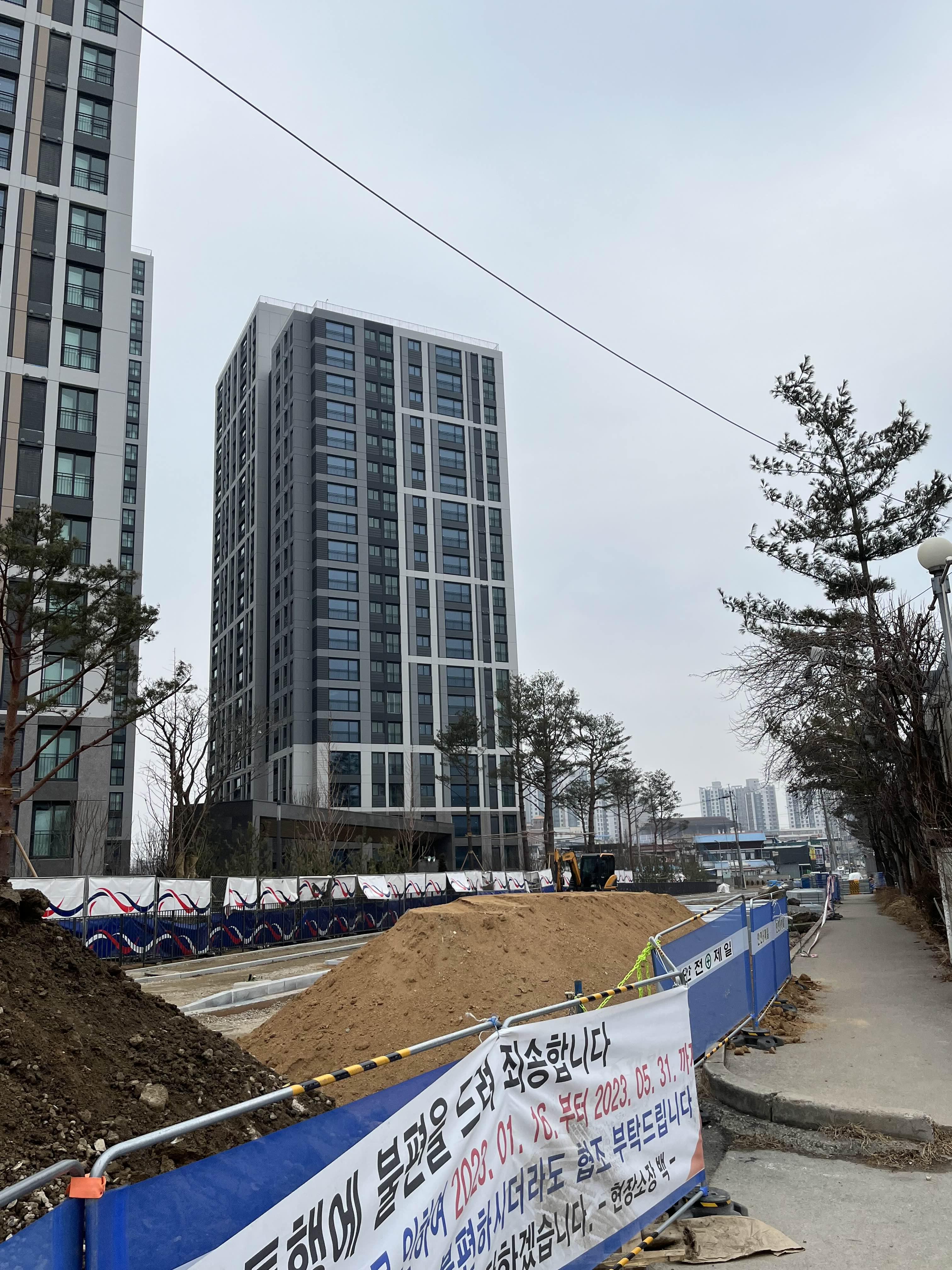상가 좌측으로는 차량 출입구가 만들어지고 있었습니다. 아무래도 근린생활시설이 있기때문에 차량 주차가 가능하도록 차량 출입구가 생길 것으로 보여집니다. 내부의 조경은 모두 마무리가 된 것 같았고 외부 도로만 공사를 진행하고 있어 곧