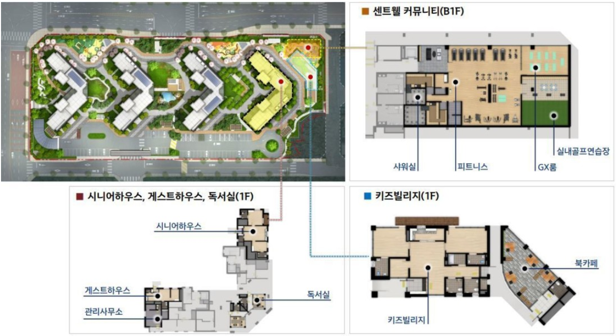 헬스장(피트니스 센터) 및 실내골프장은 단지배치도 내 우측 상단에 공간에 위치할 예정입니다. 어린이집과 북카페는 그 옆에 위치할 예정입니다. 어린이집은 확실히 세대수가 작아서 큰 편은 아닙니다.