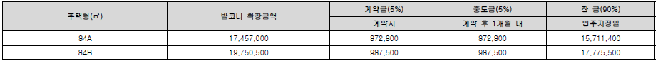 계약시 1천만원을 납부해야하며 계약 후 1개월 이내에 공급 금액의 10%를 납부해야 합니다.(약 3000만원~3800만원) 중도금은 60%이며 8월 24일, 10월 24일, 12월 22일로 20%씩 나뉘어져 있으며 나머지 잔금 30%는 입주지정일에 납부해야 합니다.