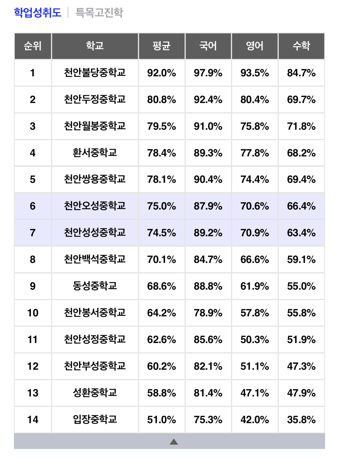 가장 가까운 중학교인 오성중학교는 학업성취도가 천안시 서북구에서 6위로 전반적으로 높지는 않습니다. 그렇지만 특목고의 진학하는 학생수는 졸업생 수에 비해 높은 편임을 알 수 있습니다.