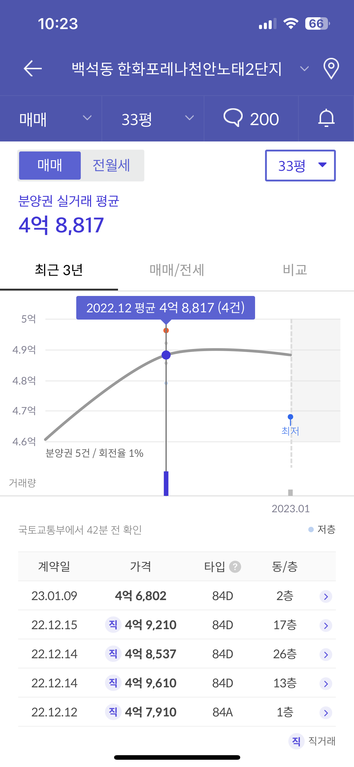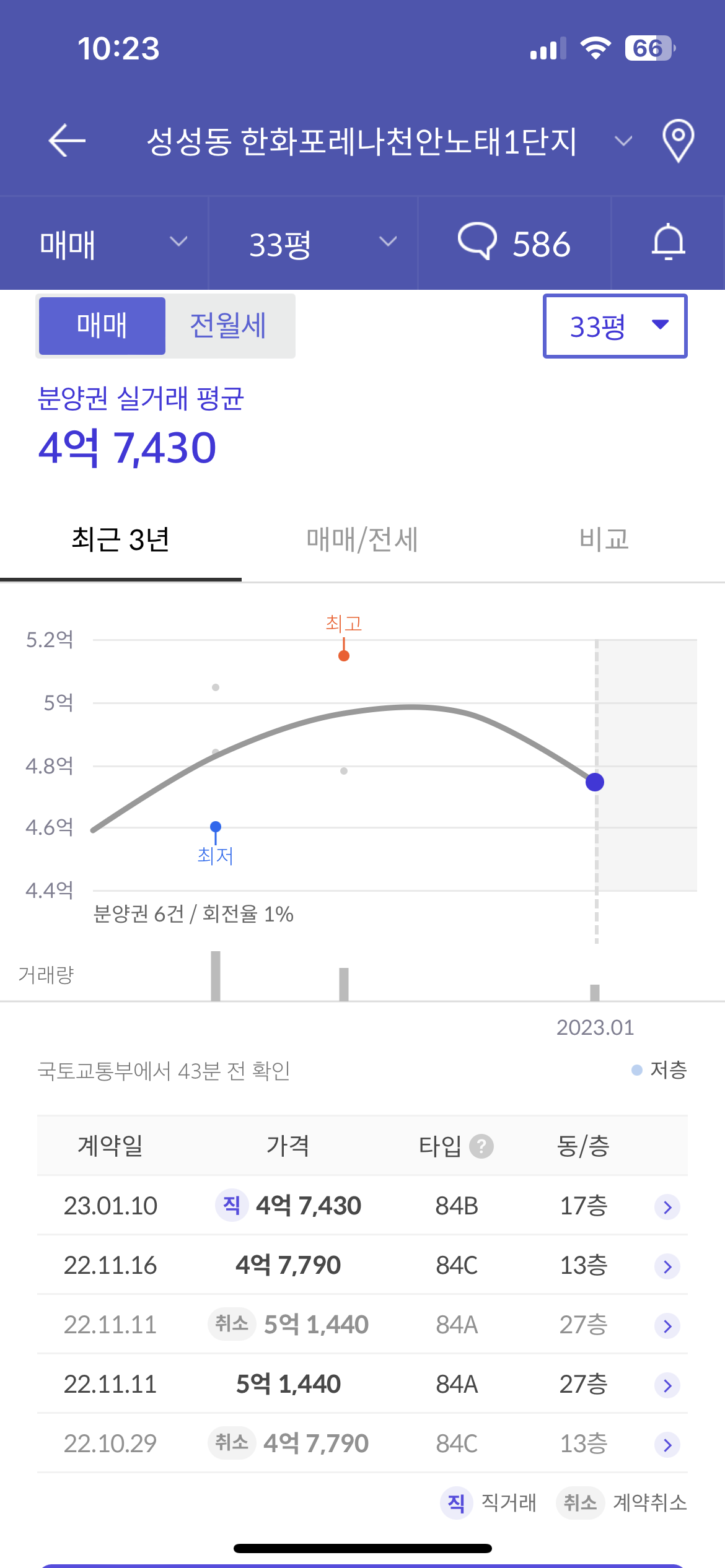 백석동엔 센트레빌과 함께 신축아파트가 지어지고 있습니다. 바로 노태 포레나인데 기부채납으로 노태공원을 만들며 2개 단지가 들어옵니다. 이 단지와는 도보 10분 이내로 가까운 거리인데 분양권 거래 기록을 한번 보도록 하겠습니다. 이 두개 단지도 모두 84m2가 주요 평형입니다. 분양권 거래로는 약 4억 중후반대에 거래되고 있습니다. 직거래가 많이 있는데 시기가 많이 안좋다보니 중개비를 아끼기 위해 진행된 것으로 보여집니다.