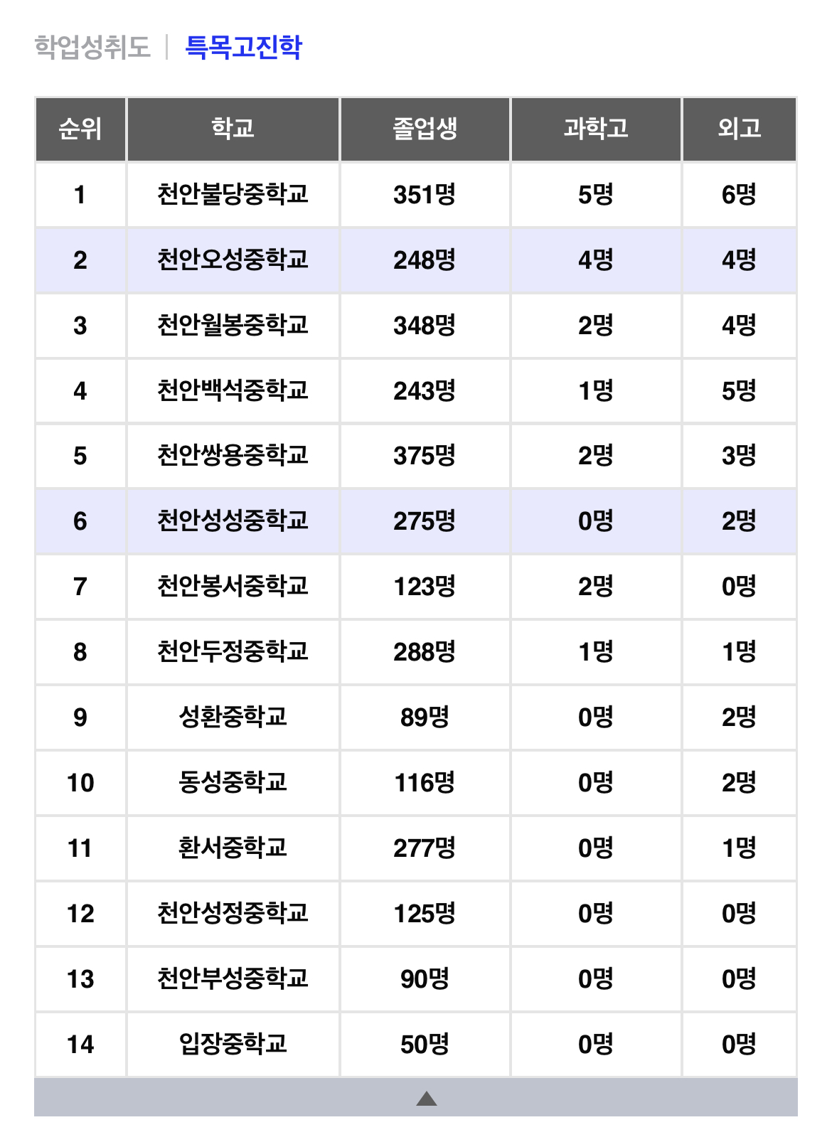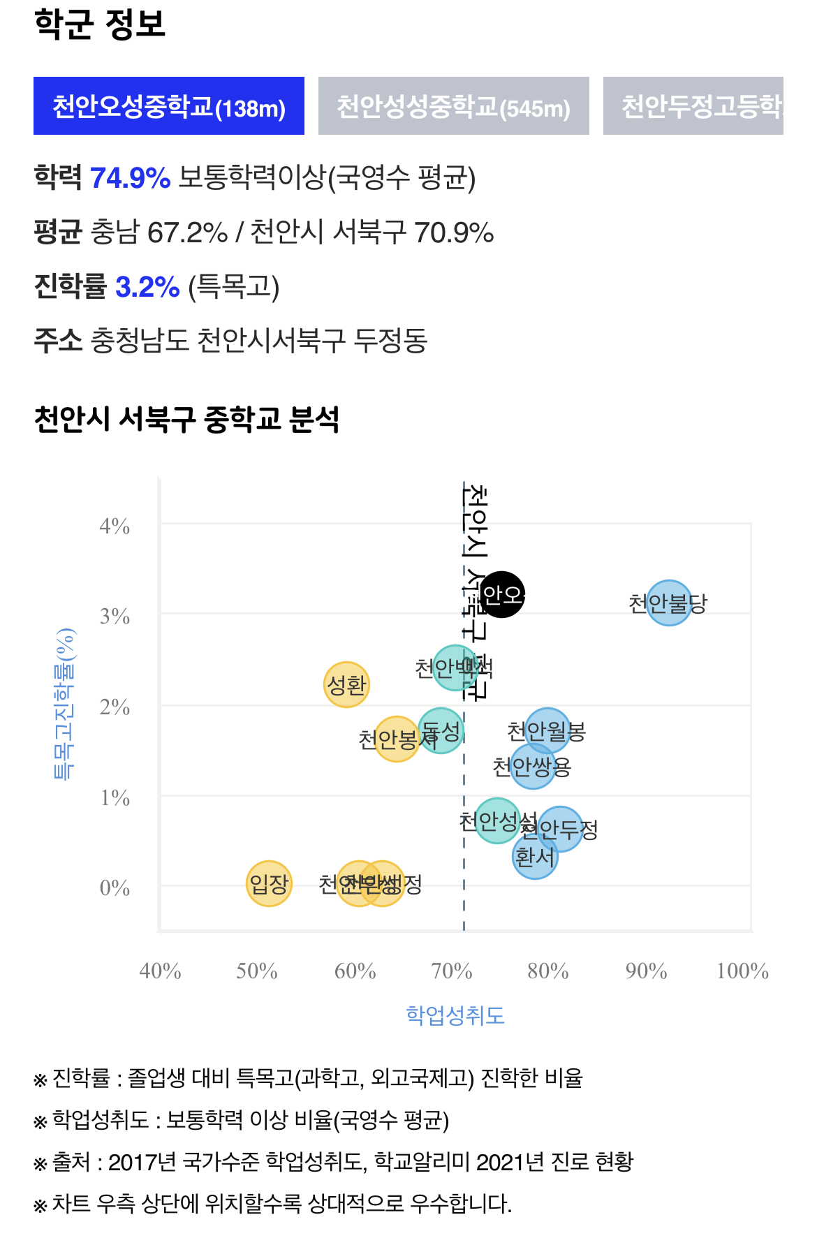 가장 가까운 중학교인 오성중학교는 학업성취도가 천안시 서북구에서 6위로 전반적으로 높지는 않습니다. 그렇지만 특목고의 진학하는 학생수는 졸업생 수에 비해 높은 편임을 알 수 있습니다.