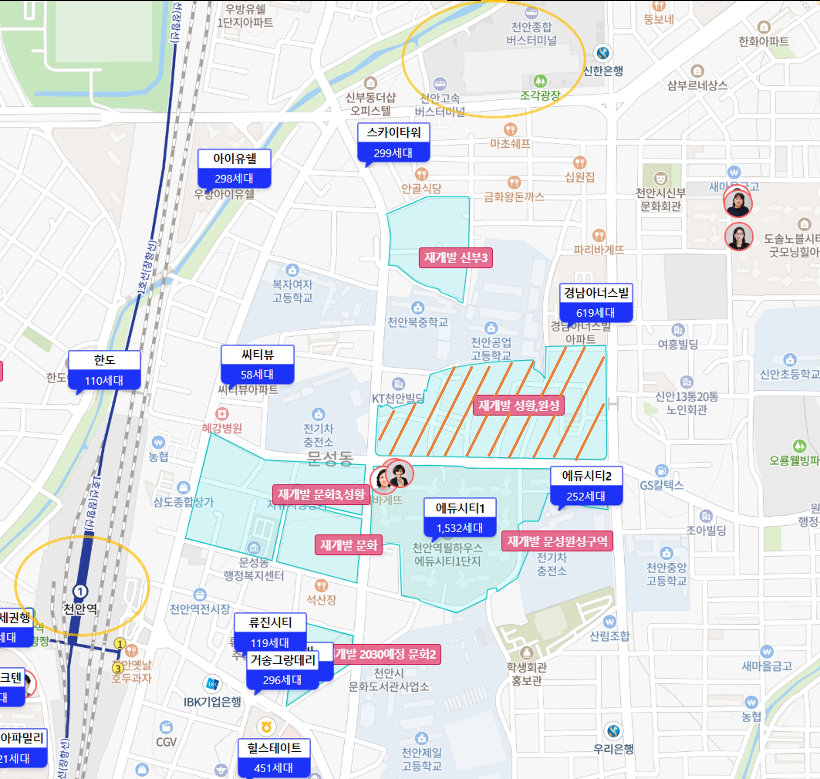 성황원성 재개발은 2개 단지로 아이파크 아파트가 들어올 예정입니다. 주변에 아래 지도와 같이 초, 중, 고등학교가 모두 도보로 가까운 거리에 위치해있어 자녀를 키우시는 분들께도 좋습니다. 그리고 천안고속버스터미널과 천안역도 가까운 위치이고 신부동의 상권을 이용하기도 용이합니다.