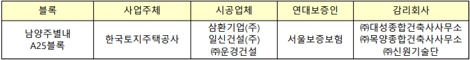- 남양주별내 A25 - LH 퍼스트포레(380세대) - SM삼환기업(우방 아이유쉘, 경남 아너스빌), 일신건설(에일린의 뜰), 운경건설