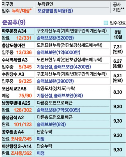LH에서는 무량판 구조로 시공된 91개의 단지 중에서 15개 단지에서 기둥 주변으로 보강 철근이 부족한 것으로 확인되었습니다. 그 대상이된 아파트는 준공이 완료된 아파트 9개 단지 중에 실제 입주한 단지는 5개 단지나 됩니다. 아직 공사중인 단지는 6개 단지로 확인되었습니다.