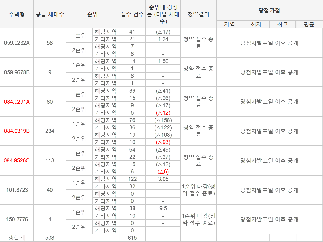 59타입의 신축 물량이 많지 않아 59타입의 경우 1순위에서 마감되었습니다. 4bay타입이 아니라 선호도가 떨어질 것 같았지만 그대로 59타입의 경우 가격적인 메리트가 있어 1순위를 끝으로 마감했습니다.