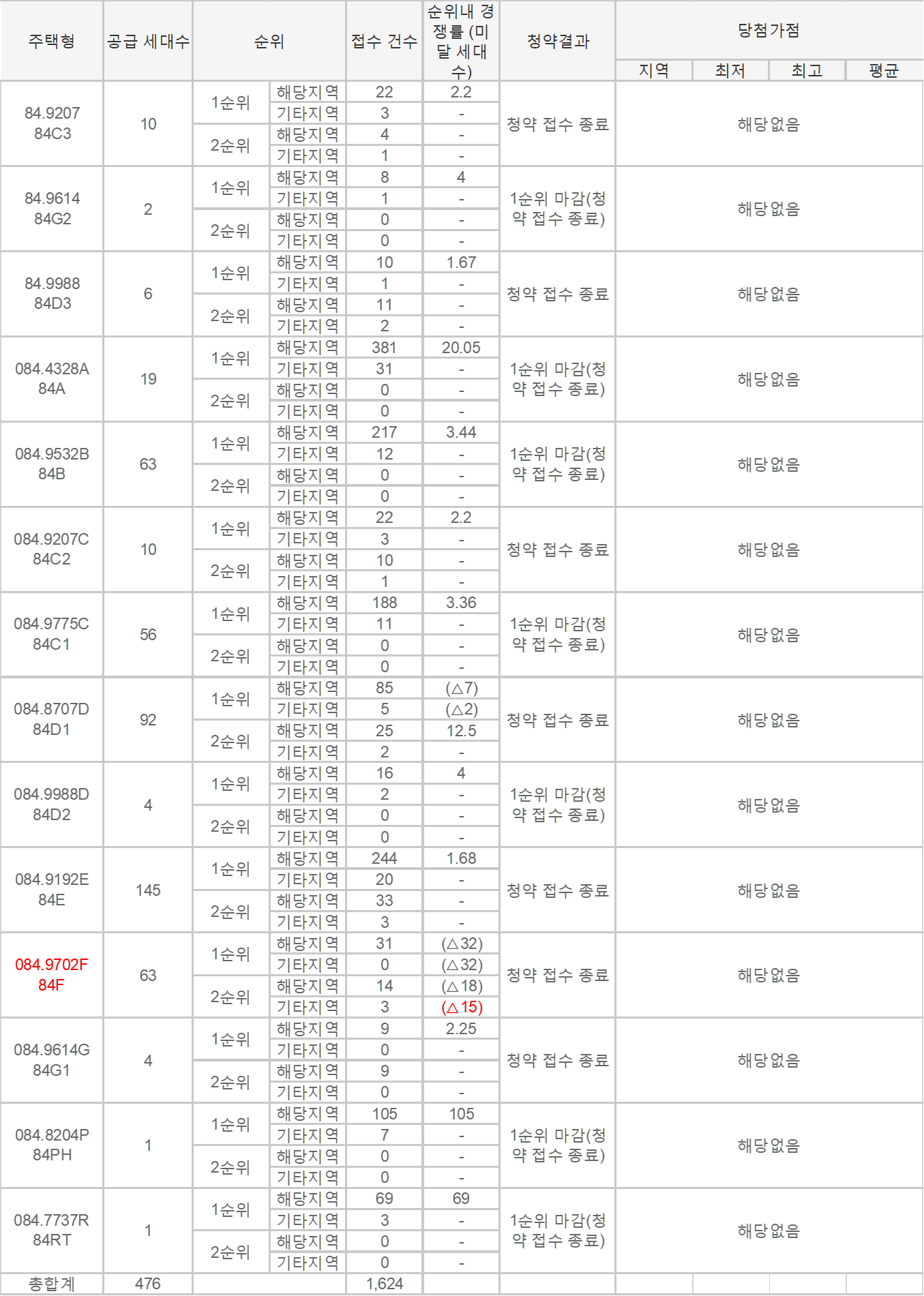 59타입의 신축 물량이 많지 않아 59타입의 경우 1순위에서 마감되었습니다. 4bay타입이 아니라 선호도가 떨어질 것 같았지만 그대로 59타입의 경우 가격적인 메리트가 있어 1순위를 끝으로 마감했습니다.