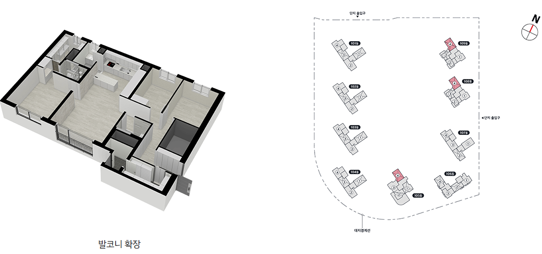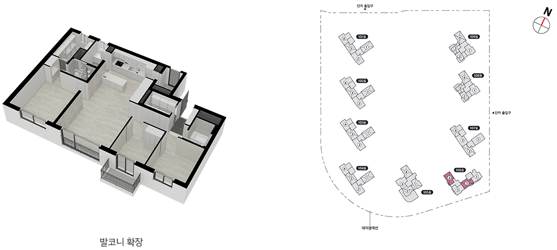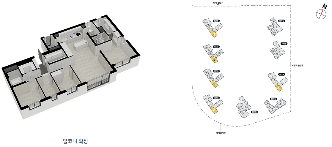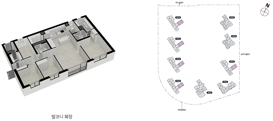 D타입과 동일한 형식이지만 방과 거실에서 크기 차이가 있습니다. D타입보다 침실2, 3과 거실이 조금 더 넓고 침실1의 크기가 줄어들었습니다. 가장 많은 세대가 공급되는 주택형입니다. 총 237세대가 공급되며 105동, 108동 및 109동에 위치해있습니다.