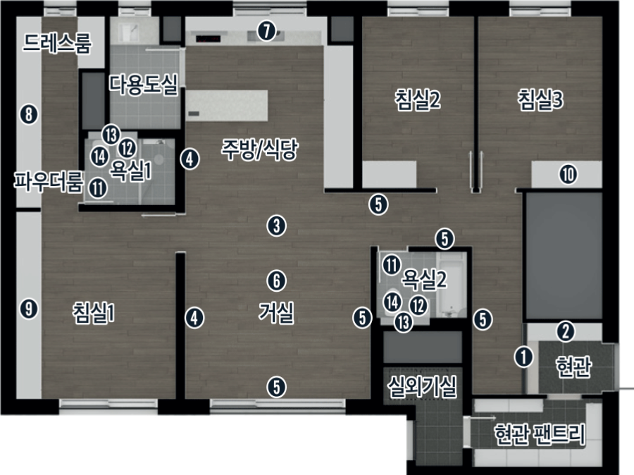 일반 주택의 C타입이라고 할 수 있는 타입입니다. 거실과 현관복도가 길게 이어져있어서 거실이 넓게 느껴질 수 있는 타입이지만 4bay타입이 아니기 때문에 환기/통풍으로 선호하지 않는 타입으로 구분되기도 합니다.