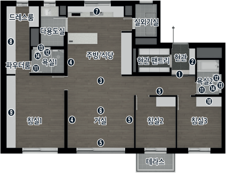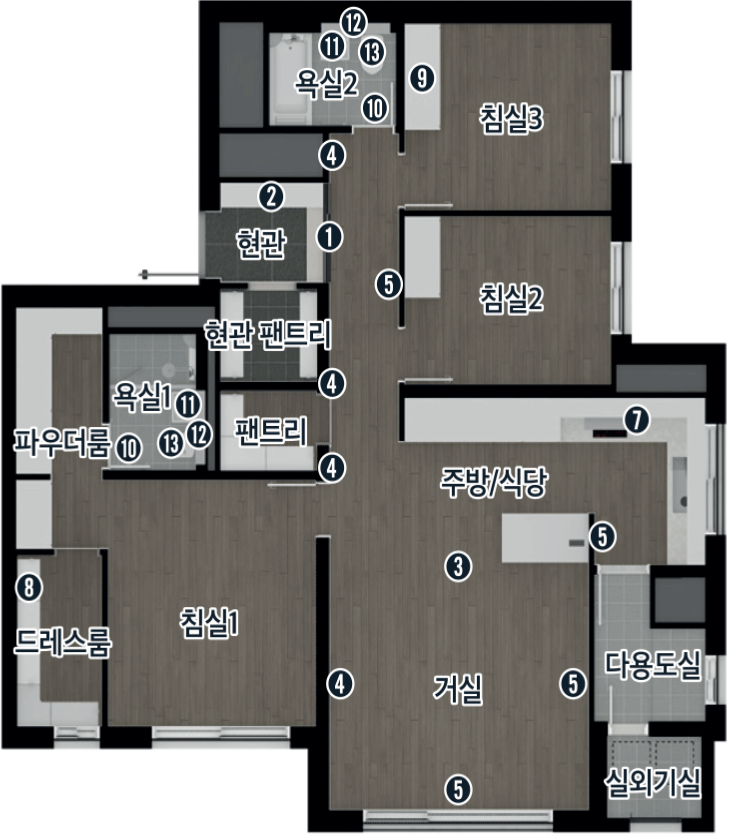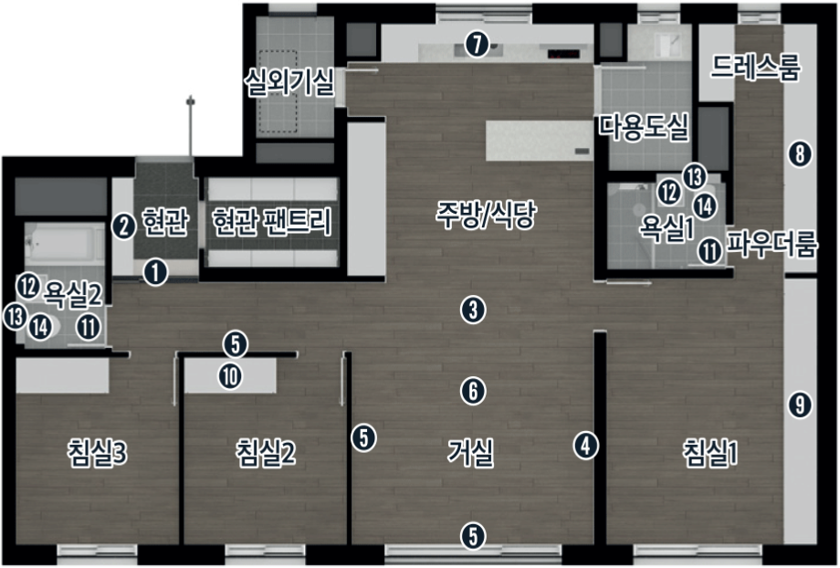 일반 주택의 C타입이라고 할 수 있는 타입입니다. 거실과 현관복도가 길게 이어져있어서 거실이 넓게 느껴질 수 있는 타입이지만 4bay타입이 아니기 때문에 환기/통풍으로 선호하지 않는 타입으로 구분되기도 합니다.