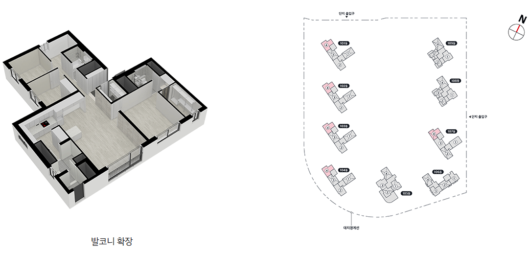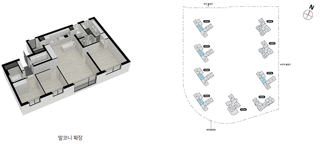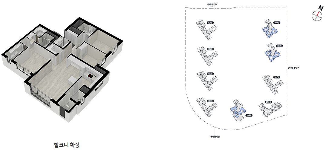 D타입과 동일한 형식이지만 방과 거실에서 크기 차이가 있습니다. D타입보다 침실2, 3과 거실이 조금 더 넓고 침실1의 크기가 줄어들었습니다. 가장 많은 세대가 공급되는 주택형입니다. 총 237세대가 공급되며 105동, 108동 및 109동에 위치해있습니다.