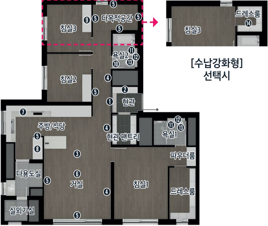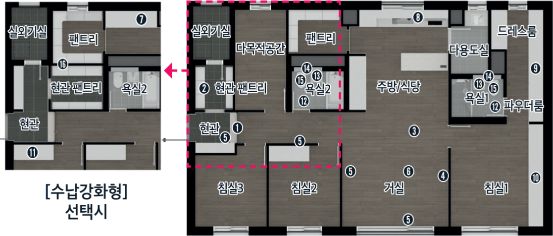 기본적으로 별도의 긴 형태의 알파룸이 존재하지만 긴 공간이기 때문에 펜트리로 주방과 현관을 나누어서 수납강화 기능을 선택할 수 있도록 유도한 것으로 보여집니다. 저 알파룸을 활용하실 수 있다면 기본 옵션으로 설정하셔도 되겠지만 수납강화 옵션을 선택하시면 더 좋을 것 같습니다.