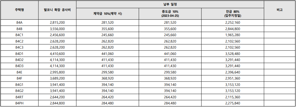 가장 중요한 공급 금액이겠죠? 계약금 10%를 요구하고 있으며 중도금 60%와 잔금 30%로 구성되어 있습니다.