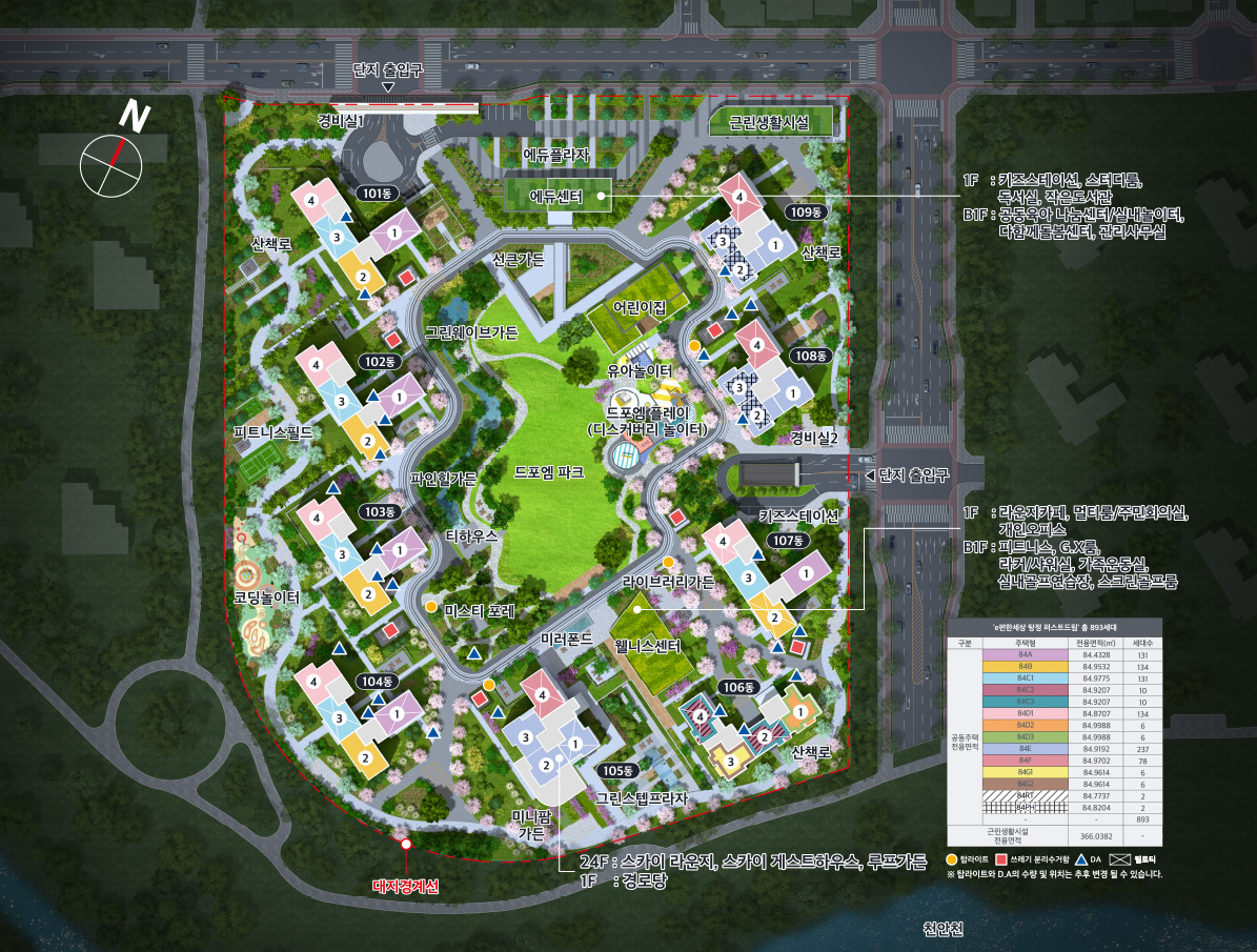 단지 남측에는 천안천(곡교천)이 흐르고 있고 천을 따라 산책로가 형성되어 있습니다. 산책로는 모두 완성이 되어있는 상태이고 자전거나 산책하시는 분들이 늘어나고 있습니다. 주택형에 따른 단지 배치는 아래의 자료를 참고해주시면 됩니다. 104동과 106동의 경우 층수가 가장 낮지만 모두 천안천 뷰를 볼 수 있는 주택형입니다. 104동에 위치한 주택형과 106동의 경우 구조는 선호도가 떨어지고 층수가 다른 단지대비 낮은 12층이기 때문에 선호도가 낮을 수는 있지만 천안천 뷰를 확보할 수 있습니다. 84C2,3와 84D2,3 그리고 84G1,2는 모두 천안천을 뷰를 볼 수 있다는 의미입니다. 각 층별 타입을 다르게 구성해놨는데 주택 평면도를 잘 확인하시고 결정하셔야 될 것 같습니다. 펜트하우스(PH)의 경우 108동과 109동에 각 1세대가 있으며 106동 탑층 2세대의 경우 루프탑(RT)세대입니다.