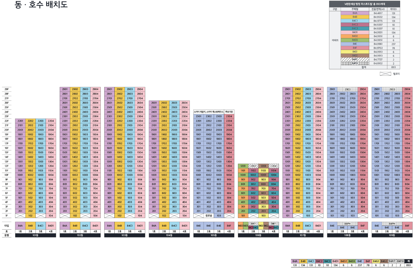 세대는 모두 84m2형이며 타입이 A타입부터 G타입까지 다양하게 구분되어있습니다.(펜트하우스와 루프탑형도 있습니다.)