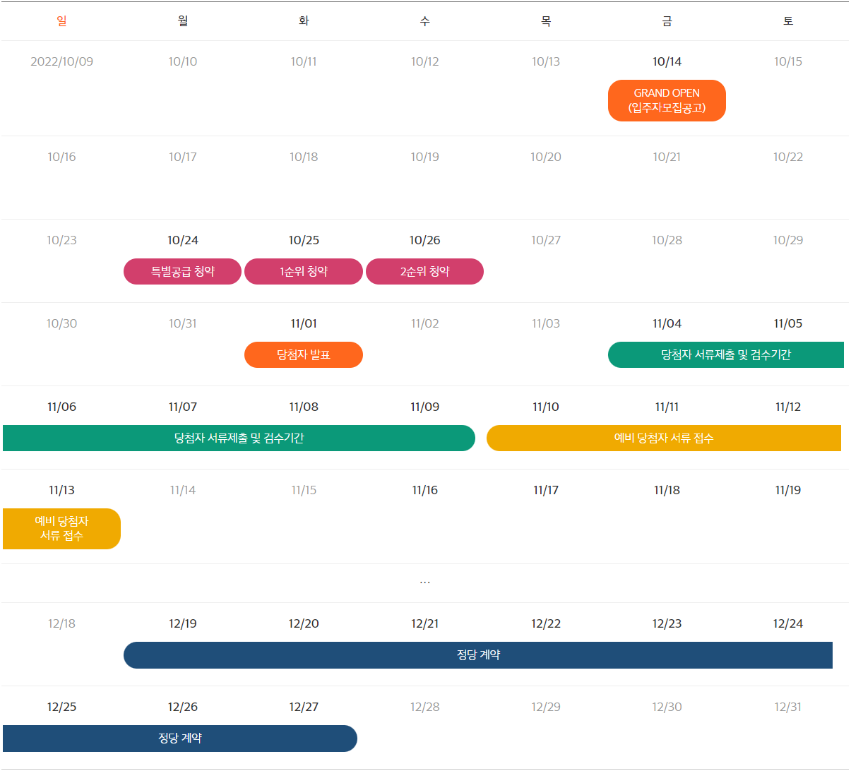 청약 시작은 10월 24일부터 진행되며 26일까지 2순위 청약이 진행됩니다. 청약이 단 3일만에 끝나기 때문에 빨리 끝난다고 할 수 있습니다. 일주일 뒤인 11월 01일에 당첨자가 발표되며 11월 04일부터 11월 09일까지 서류 제출 및 검수기간을 거치게 됩니다. 서류에서 부적격을 받거나 서류를 제출하지 않은 당첨 세대가 있는 경우 11월 10일부터 13일까지 예비당첨자가 서류를 다시 넣게 됩니다. 그 뒤 12월 19일부터 12월 27일까지 정당 계약을 진행하게 됩니다. 이때부터는 계약금이 들어가게 됩니다. 그리고 입주일은 2025년 01월로 예정되어있습니다.